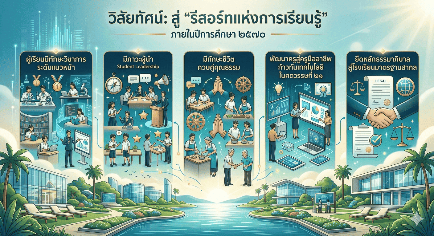 ภายในปีการศึกษา ๒๕๗๐ มุ่งพัฒนาสถานศึกษาเพื่อเป็น “รีสอร์ทแห่งการเรียนรู้” ผู้เรียนมีทักษะ